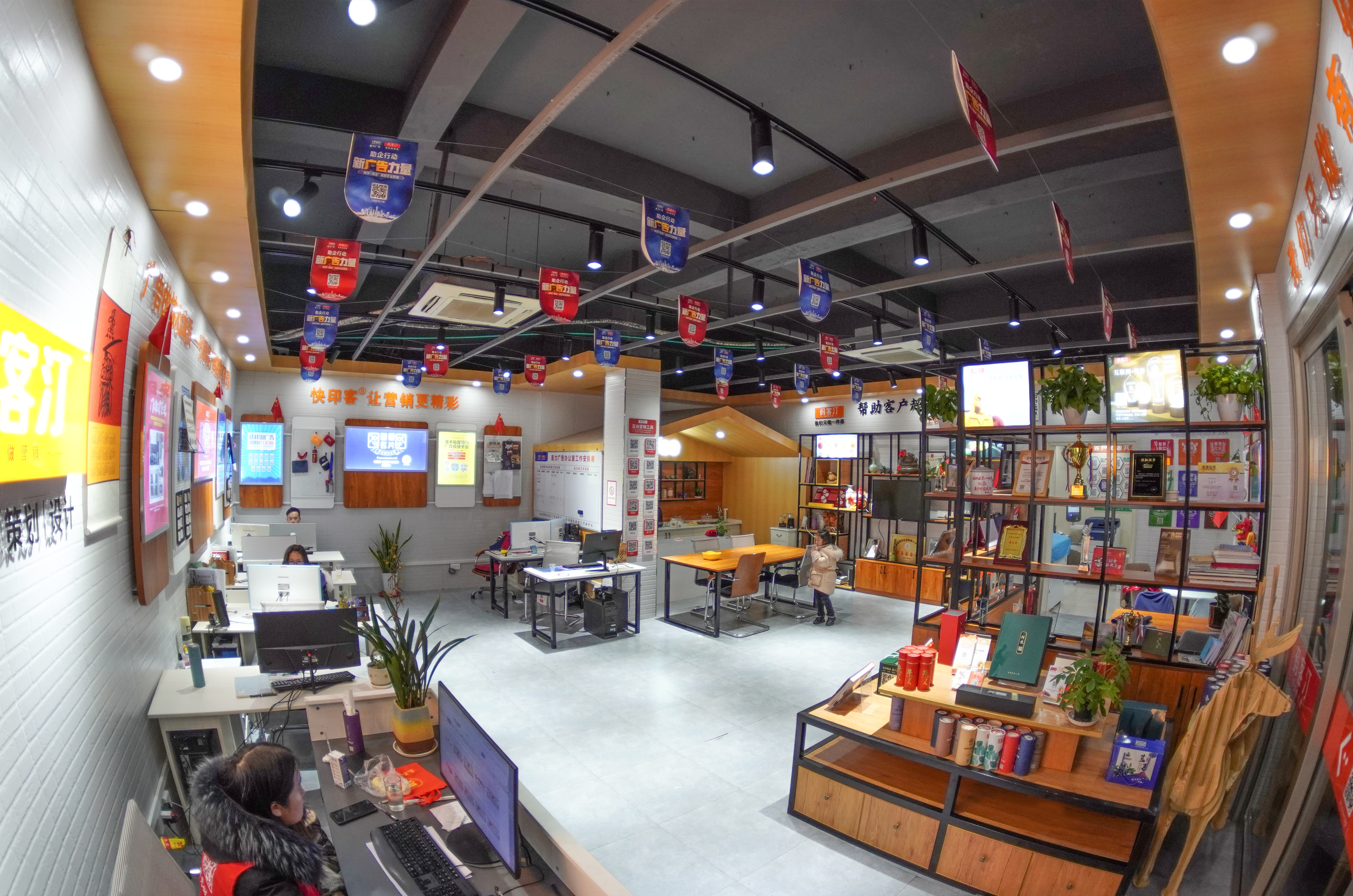 廣告快印店怎么布置工位,廣告快印店的工位布置不僅是工作環(huán)境的展現,更是提升客戶體驗與工作效能的關鍵。對于小店而言,工位區(qū)也是客戶接待區(qū)。借用快印客的營銷布局策略,——工位不能面壁思過,一定要面向大門,面向客戶,不能讓客戶一進門就看到員工冷冰冰的背影,印象分會很差。面向客戶的話,有客戶上門我們可以及時發(fā)現,用十步示意法及時接待,避免錯過客戶。